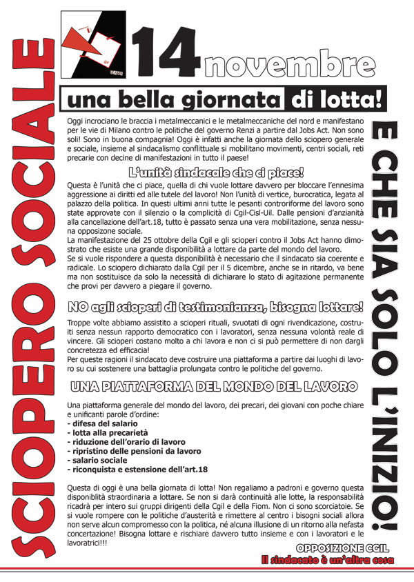 Sciopero sociale: non è che l’inizio! Pubblicati su 12 novembre 2014 da Eliana Como in volantini e locandine // 0 Commenti Volantino per il 14 novembre. Scarica Condividi: Condividi su X (Si apre in una nuova finestra) X Condividi su Facebook (Si apre in una nuova finestra) Facebook Stampa (Si apre in una nuova finestra) Stampa Invia un link a un amico via e-mail (Si apre in una nuova finestra) E-mail Condividi su WhatsApp (Si apre in una nuova finestra) WhatsApp Condividi su Telegram (Si apre in una nuova finestra) Telegram Mi piace Caricamento... Correlati