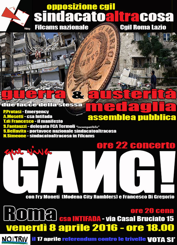 Guerra e politica di austerità: due facce della stessa medaglia. Venerdì 8 Aprile – ore 18:00 Assemblea Pubblica, CSA Intifada – Via Casal Bruciato, 15 – Roma. A seguire cena e concerto de I GANG