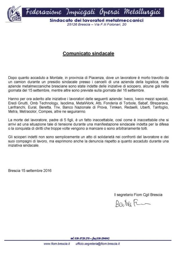 Sui fatti di Piacenza. I comunicati FIOM Milano, Brescia e Modena.