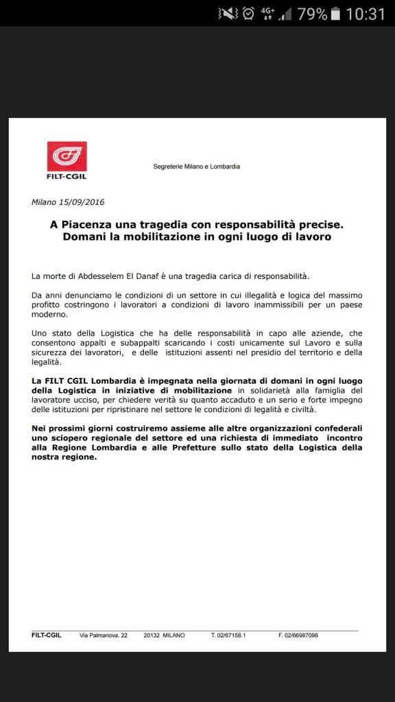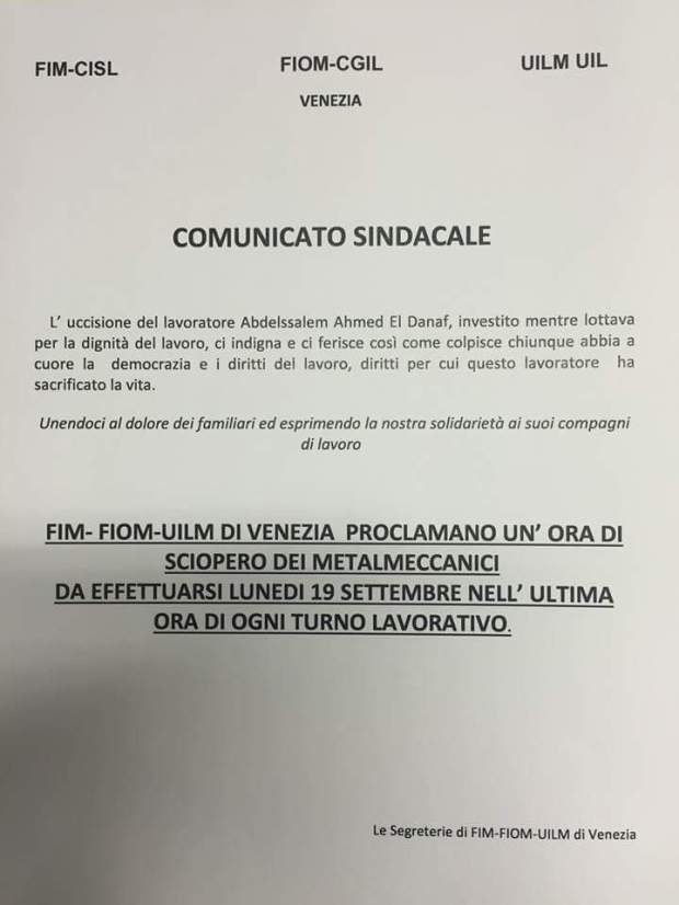 In queste ore si stanno diffondendo in tutta Italia, nelle fabbriche e nelle aziende, comunicati ed iniziative di sciopero per la morte di Abd Elsalam Ahmed Eldanf. Un’iniziativa che si sta allargando a macchia d’olio, spesso a partire dall’autonoma e spontanea reazione di delegati e delegate, al di là di ogni appartenenza sindacale (non solo dei sindacati di base o della CGIL, ma anche della CISL e di altre organizzazioni. Pubblichiamo ad esempio, in fondo a questa pagina, il comunicato della FIM-CISL di Milano, che sostiene tutte le iniziative di protesta indette dalle RSU nel comprensorio. Come, in ultimo, l’indizione di un ora di sciopero a fine turno per lunedì prossimo da parte di FIOM FIM e UILM di Venezia, che abbiamo appena ricevuto).