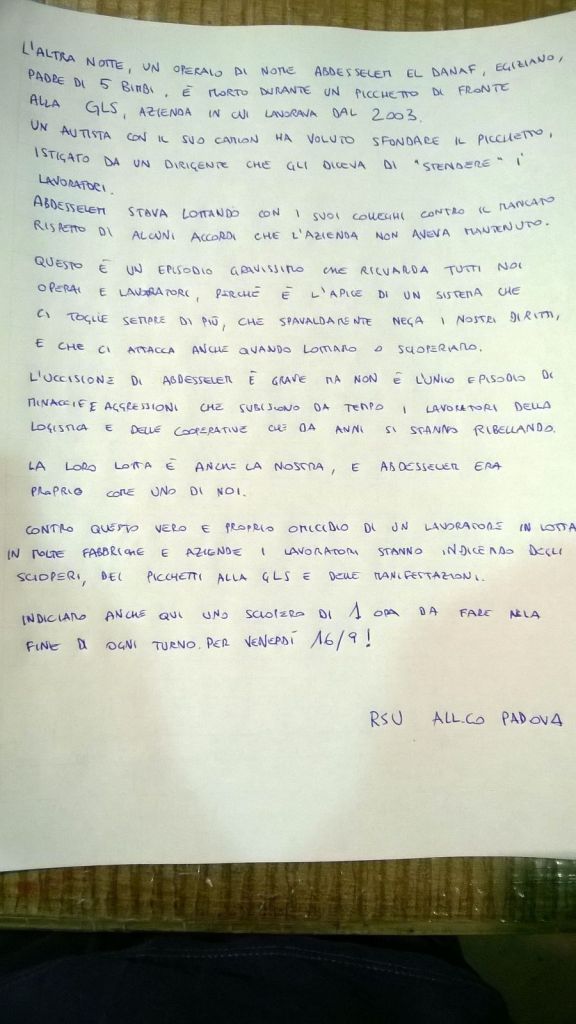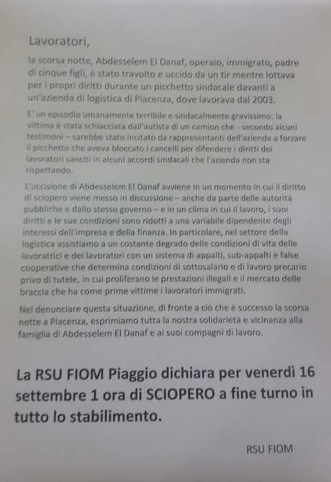 In queste ore si stanno diffondendo in tutta Italia, nelle fabbriche e nelle aziende, comunicati ed iniziative di sciopero per la morte di Abd Elsalam Ahmed Eldanf. Un’iniziativa che si sta allargando a macchia d’olio, spesso a partire dall’autonoma e spontanea reazione di delegati e delegate, al di là di ogni appartenenza sindacale (non solo dei sindacati di base o della CGIL, ma anche della CISL e di altre organizzazioni. Pubblichiamo ad esempio, in fondo a questa pagina, il comunicato della FIM-CISL di Milano, che sostiene tutte le iniziative di protesta indette dalle RSU nel comprensorio. Come, in ultimo, l’indizione di un ora di sciopero a fine turno per lunedì prossimo da parte di FIOM FIM e UILM di Venezia, che abbiamo appena ricevuto).