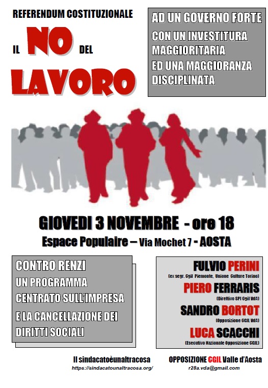 3 novembre, Aosta. Il NO del lavoro. Incontro pubblico contro sul Referendum Costituzionale. Pubblicati su 23 ottobre 2016 da lucascacchi in appuntamenti, referendum // 0 Commenti Condividi: Fai clic per condividere su X (Si apre in una nuova finestra) X Fai clic per condividere su Facebook (Si apre in una nuova finestra) Facebook Fai clic qui per stampare (Si apre in una nuova finestra) Stampa Fai clic per inviare un link a un amico via e-mail (Si apre in una nuova finestra) E-mail Fai clic per condividere su WhatsApp (Si apre in una nuova finestra) WhatsApp Fai clic per condividere su Telegram (Si apre in una nuova finestra) Telegram Mi piace Caricamento... Correlati referedum