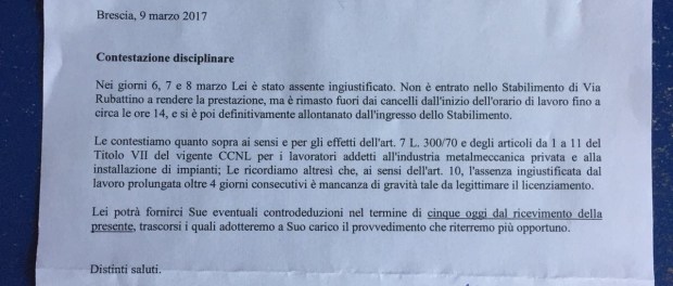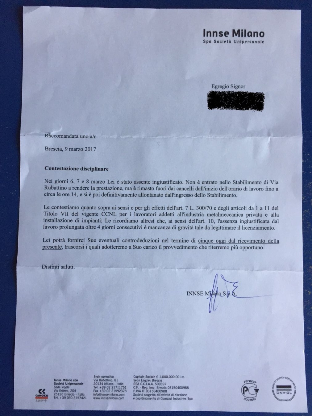 Una lettera di contestazione disciplinare, per esser rimasto fuori da cancelli.... durante uno sciopero!