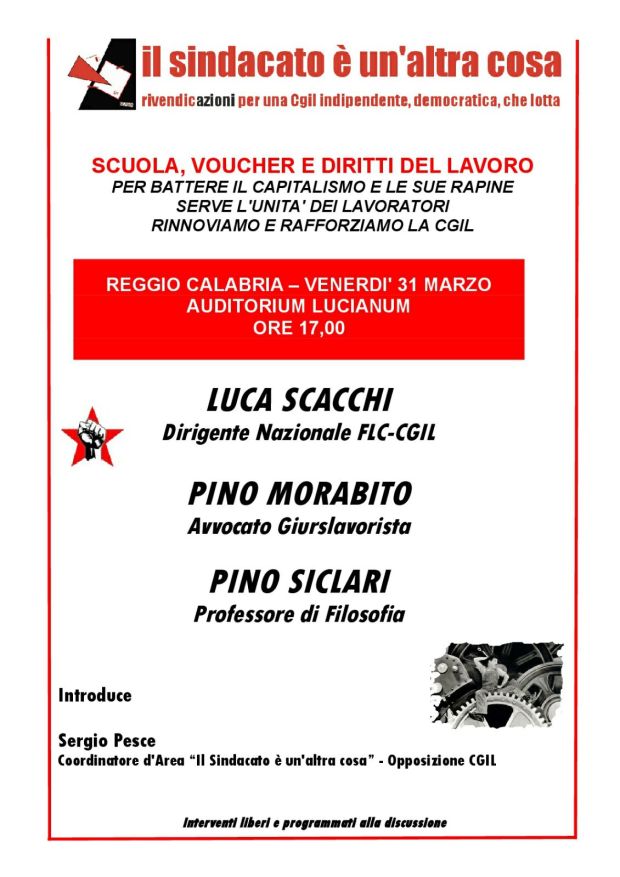 Reggio Calabria. 31 marzo 2017: incontro su scuola voucher e diritti del lavoro. Pubblicati su 27 marzo 2017 da lucascacchi in appuntamenti // 0 Commenti SCUOLA VOUCHER E DIRITTI DEL LAVORO DIBATTITO PUBBLICO ORGANIZZATO DAL SINDACATOALTRACOSA – OPPOSIZIONECGIL AUDITURIUM LUCIANUM ORE 17 REGGIO CALABRIA Condividi: Fai clic per condividere su X (Si apre in una nuova finestra) X Fai clic per condividere su Facebook (Si apre in una nuova finestra) Facebook Fai clic qui per stampare (Si apre in una nuova finestra) Stampa Fai clic per inviare un link a un amico via e-mail (Si apre in una nuova finestra) E-mail Fai clic per condividere su WhatsApp (Si apre in una nuova finestra) WhatsApp Fai clic per condividere su Telegram (Si apre in una nuova finestra) Telegram Mi piace Caricamento... Correlati