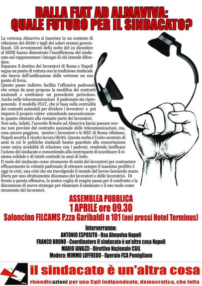 Assemblea pubblica. Sabato dalle ore 9:30 alle ore 13:00, presso il saloncino FILCAMS, p.zza Garibaldi 101 (nei pressi dell’Hotel Terminus), Napoli. Interverranno Antonio Esposito (rsu Almaviva), Franco Bruno (sindacatoaltracosa Napoli), Mario Iavazzi (dir. naz. CGIL). Modera Mimmo Loffredo (FCA Pomigliano).