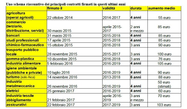 Nel corso del 2016, gli aumenti sono poi via via persino diminuiti e i contratti hanno assunto quasi tutti la durata di 4 anni (fa eccezione soltanto quello degli assicurativi recentemente firmato su 3 anni), attestandosi tra i 70 euro dei tessili e i 50 euro dei metalmeccanici. Anche gli 88 euro del contratto nazionale del turismo a novembre del 2016 non sono stati certo una eccezione, considerando che il contratto, scaduto da tempo, copre un periodo di ben 6 anni (peraltro, questo contratto interessa soltanto una minima parte delle imprese alberghiere e del turismo, quella rappresentata dall’associazione Aica. La maggior parte dei lavoratori e delle lavoratrici sono ancora senza contratto).