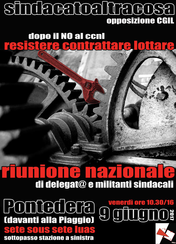 Accogliendo la proposta che di seguito pubblichiamo dei delegati e lavoratori di Piaggio e Continental, il sindacatoaltracosa in FIOM convoca una riunione nazionale di delegat@ e militanti dell’area a Pontedera il 9 giugno, dalle ore 10.30, presso il centro “Sete sous sete luas” (a sinistra dopo l’uscita del sottopasso della stazione, lato Piaggio).