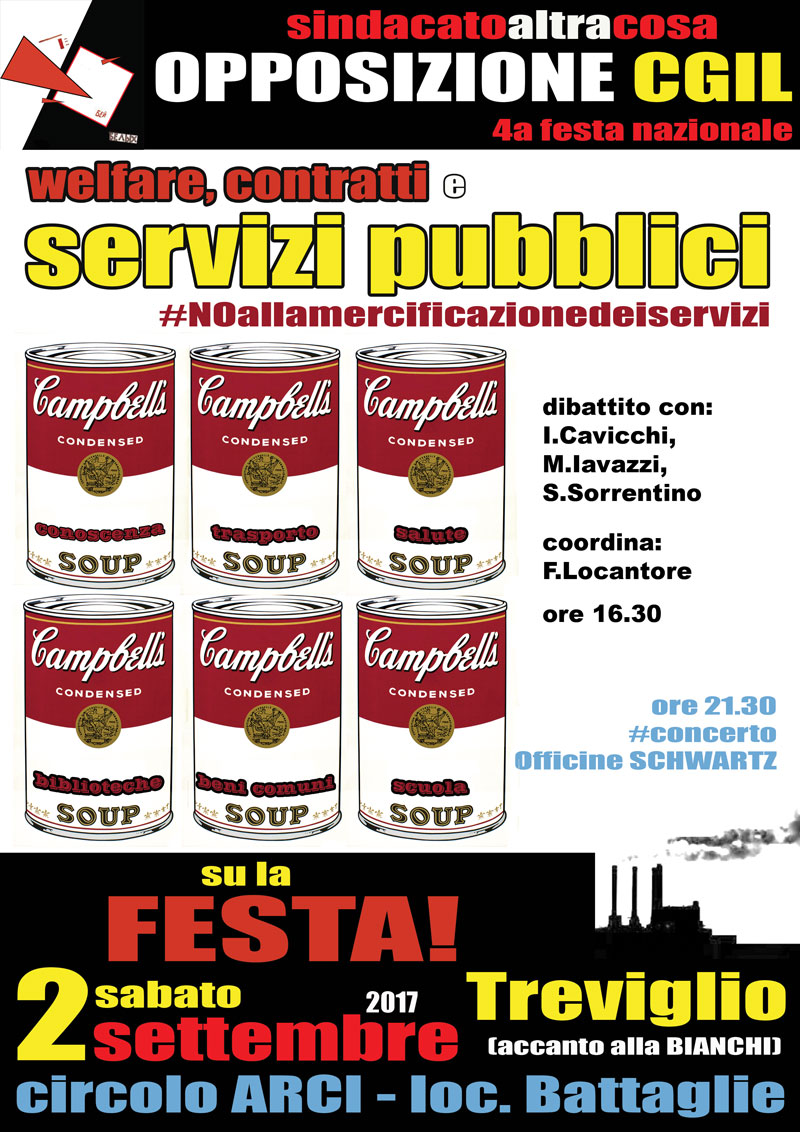 Presso la 4a Festa nazionale dell’area all’Arci di Treviglio (vedi programma completo), sabato 2 settembre ore 16.30, dibattito su Welfare, contratti e servizi pubblici con Ivan Cavicchi (Università Tor Vergata di Roma), Mario Iavazzi (sindacatoaltrocosa FP), Serena Sorrentino (segretaria generale FP CGIL). Coordina Francesco Locantore (sindacatoaltracosa FLC).