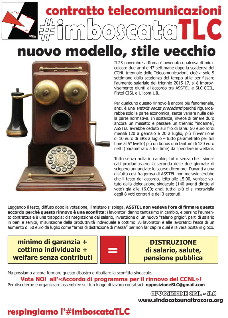 Leggendo il testo, diffuso dopo la votazione, il mistero si spiega. ASSTEL non vedeva l’ora di firmare questo accordo perché questo rinnovo è una sconfitta: i lavoratori danno tantissimo in cambio, e persino l’aumento contrattuale è una trappola: disintegrazione del salario, invenzione di un nuovo “salario grigio”, parti di salario in beni e servizi, misurazione della produttività individuale e cottimo! Ai lavoratori e alle lavoratrici l’esca di un aumento di 50 euro da luglio come “arma di distrazione di massa” per non far capire qual è la vera posta in gioco. Ma possiamo ancora fermare questo disastro e ribaltare la sconfitta sindacale. Vota NO! all’«Accordo di programma per il rinnovo del CCNL»! Per discuterne e organizzare assemblee sul tuo luogo di lavoro contattaci: opposizioneSLC@gmail.com