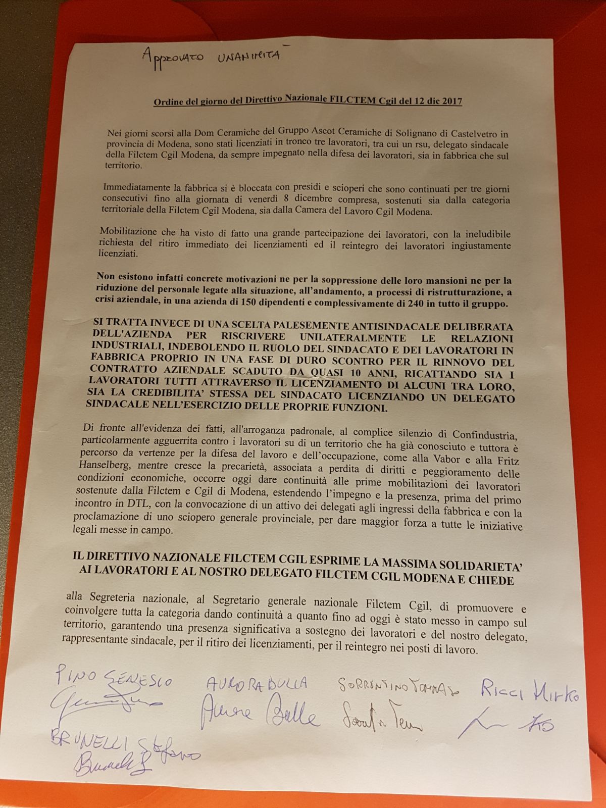 Ordine del giorno direttivo nazionale FILCTEM Cgil del 12 dic 2017
