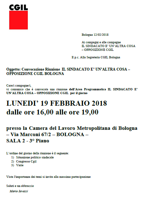 Bologna, 19 febbraio. Riunione OpposizioneCgil alle 16.