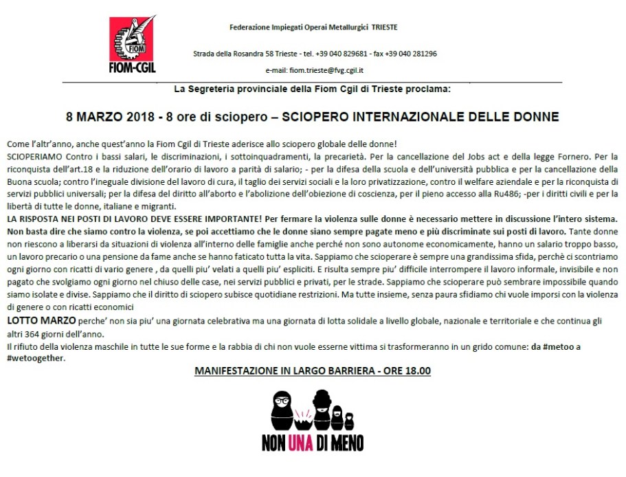 Nonunadimeno, come lo scorso anno, ha proclamato anche in Italia una giornata di lotta per il prossimo otto marzo, in occasione dello sciopero globale delle donne. Noi sosteniamo pienamente questa iniziativa. La Fiom Trieste, come altre RSU, aderisce con 8 ore di sciopero. Come OpposizioneCgil riteniamo sbagliato che la Cgil né altre categorie non abbiano aderito nemmeno quest’anno. Noi sosterremo lo sciopero a tutti i livelli.