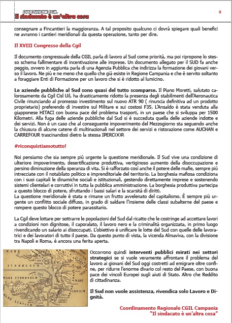 La Cgil deve lottare per sottrarre le popolazioni del Sud dal ricatto che le costringe ad accettare lavori a condizioni non dignitose, il caporalato, il lavoro nero e la criminalità organizzata, in primo luogo rivendicando un salario ai disoccupati. L’obiettivo è unificare le lotte del Sud con quelle delle lavoratrici e dei lavoratori di tutto il paese. Da questo punto di vista, la vicenda Almaviva, con la divisione tra Napoli e Roma, è ancora una ferita aperta. (…)