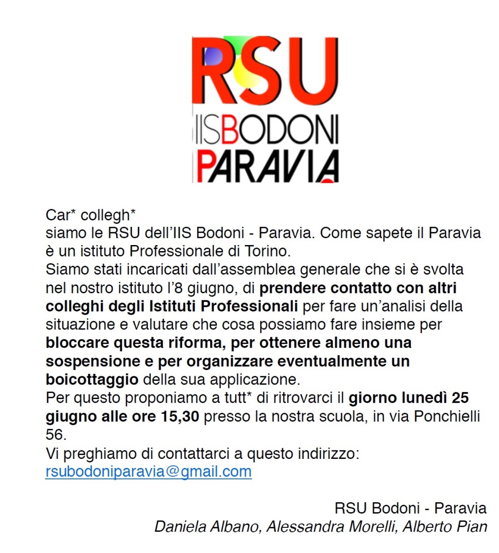 Le RSU dell’istituto Professionale Bodoni – Paravia di Torino, su mandato dell’assemblea generale della propria scuola, convocano un incontro per valutare insieme come bloccare questa riforma, per ottenere almeno una sospensione e per organizzare eventualmente un boicottaggio della sua applicazione.