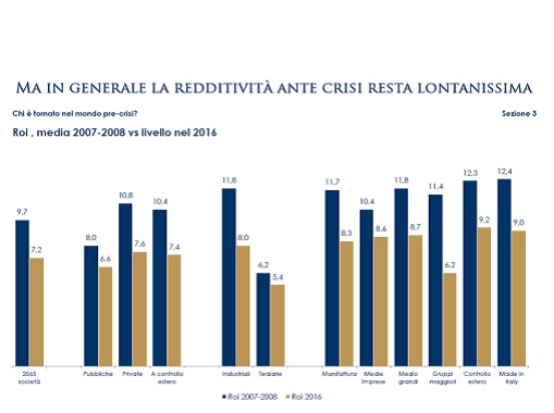 Per tutti, in ogni caso, le difficoltà sono ancora evidenti e, come segnala Mediobanca, la redditività ante crisi rimane lontanissima (come, d’altronde, gli investimenti: -34,9% per l’industria pubblica e -21,8% per il privato).