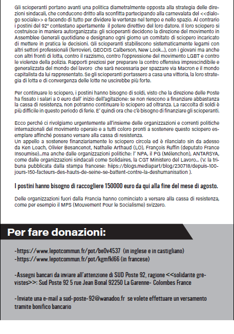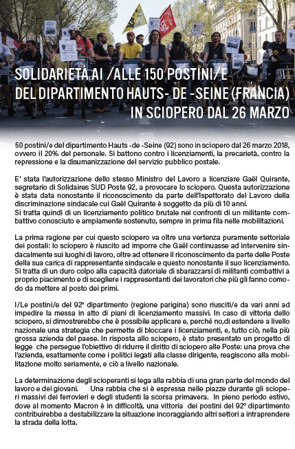 Dal 26 marzo 2018, circa 150 postine e postini dell’ Hauts-de-Seine sono in sciopero ad oltranza per impedire il licenziamento di Gaël Quirante, e anche contro la degradazione delle loro condizioni di lavoro. <<Difendendo la causa dei postini dell’ Hauts-de-Seine, è una società di diritti collettivi e di solidarietà che noi difendiamo>> sottolineano le molteplici personalità che firmano questa tribuna. Una cassa di resistenza è online.