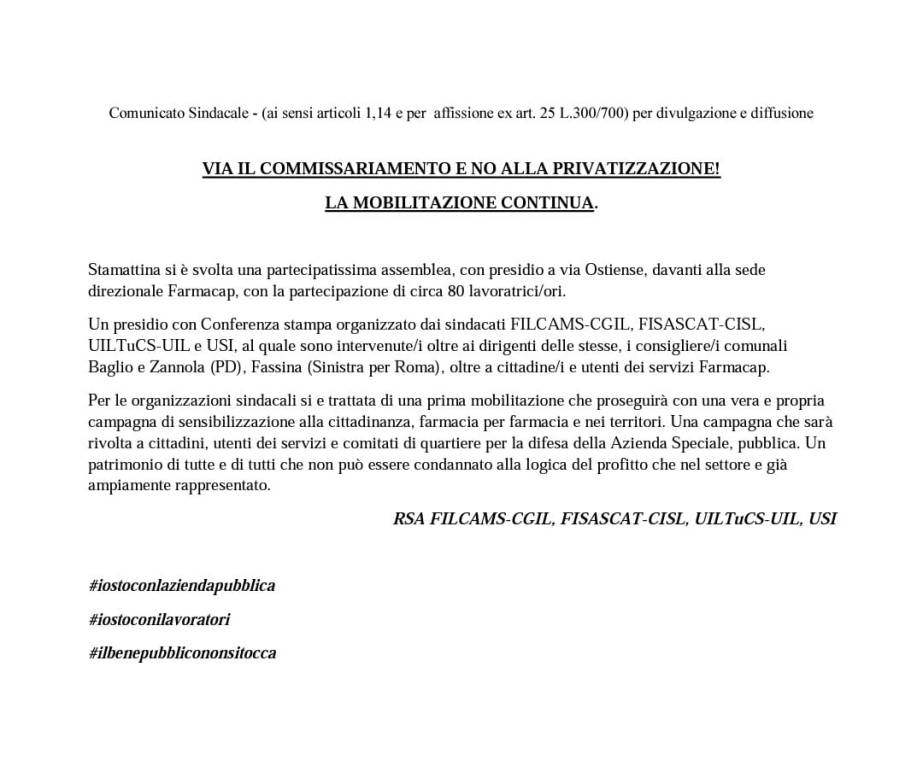 Sotto la sede di Farmacap – via Ostiense 131, Roma – il presidio dei lavoratori e delle lavoratrici che operano all’interno delle farmacie comunali Farmacap: perchè Farmacap rimanga pubblica; per la nomina di un CdA e di un direttore generale dopo 6 anni di commissariamento, per un rilancio dell’azienda da parte del Comune di Roma senza nessuna privatizzazione.