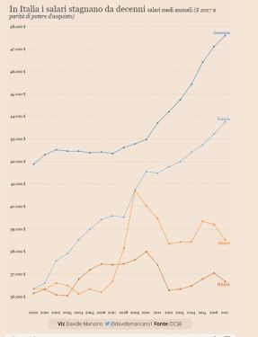 Davide Mancino, proprio ieri, ha sottolineato come “i numeri dell’OCSE mostrano che esiste un’enorme differenza nelle retribuzioni italiane rispetto a quelle degli altri partner europei, e questo è uno dei tanti effetti di decenni di mancata crescita. All’inizio degli anni 2000, per esempio, i salari medi annuali in Italia erano praticamente identici a quelli spagnoli e francesi, ma già superati nettamente dai tedeschi. Da allora però essi sono praticamente rimasti dov’erano, con solo qualche miglioramento marginale, mentre tutti gli altri sono aumentati. La differenza con i lavoratori tedeschi, già non proprio piccola in partenza, è diventata enorme.”
