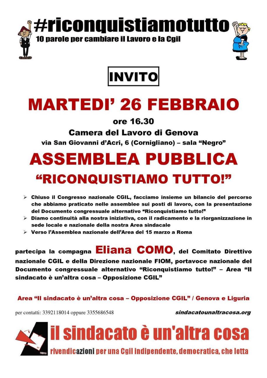 26 febbraio, Genova. #Riconquistiamotutto! Assemblea pubblica Pubblicati su 15 febbraio 2019 da Eliana Como in appuntamenti // 0 Commenti Martedì 26 febbraio, ore 16.00, presso la Cgil di Genova (sala A. Negro, via San Giovanni d’Acri, 6 Cornigliano) assemblea dei compagni e delle compagne di Riconquistiamotutto! Il sindacato è un’altra cosa. Parteciperà Eliana Como Condividi: Fai clic per condividere su X (Si apre in una nuova finestra) X Fai clic per condividere su Facebook (Si apre in una nuova finestra) Facebook Fai clic qui per stampare (Si apre in una nuova finestra) Stampa Fai clic per inviare un link a un amico via e-mail (Si apre in una nuova finestra) E-mail Fai clic per condividere su WhatsApp (Si apre in una nuova finestra) WhatsApp Fai clic per condividere su Telegram (Si apre in una nuova finestra) Telegram Mi piace Caricamento... Correlati