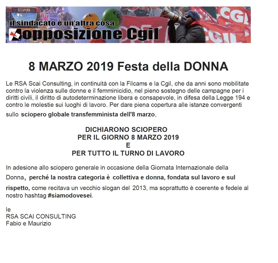 8 marzo: anche SCAI in sciopero Si diffonde l'adesione allo sciopero dell'8 marzo tra delegati/e e strutture CGIL Pubblicati su 7 marzo 2019 da lucascacchi in luoghi di lavoro, z_carosello // 0 Commenti Condividi: Condividi su X (Si apre in una nuova finestra) X Condividi su Facebook (Si apre in una nuova finestra) Facebook Stampa (Si apre in una nuova finestra) Stampa Invia un link a un amico via e-mail (Si apre in una nuova finestra) E-mail Condividi su WhatsApp (Si apre in una nuova finestra) WhatsApp Condividi su Telegram (Si apre in una nuova finestra) Telegram Mi piace Caricamento... Correlati 8 marzolottomarzononunadimenoscai consultingsciopero