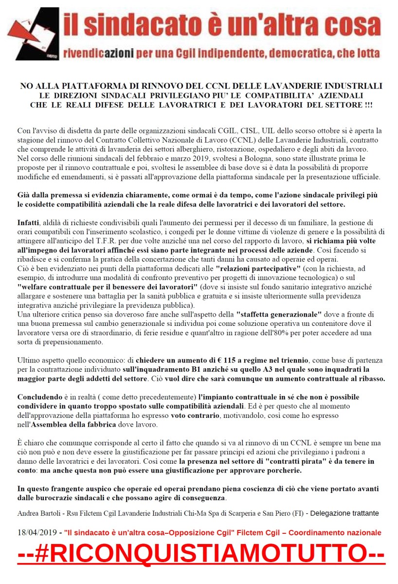 Lavanderie industriali: no all’ipotesi di piattaforma Filctem Cgil, Femca Cisl e Uiltec Uil. Comunicato dell'area Riconquistiamotutto in FILCTEM Pubblicati su 19 aprile 2019 da lucascacchi in categorie, chimici-elettrici-tessili, z_carosello // 0 Commenti Qui il testo in PDF Condividi: Fai clic per condividere su X (Si apre in una nuova finestra) X Fai clic per condividere su Facebook (Si apre in una nuova finestra) Facebook Fai clic qui per stampare (Si apre in una nuova finestra) Stampa Fai clic per inviare un link a un amico via e-mail (Si apre in una nuova finestra) E-mail Fai clic per condividere su WhatsApp (Si apre in una nuova finestra) WhatsApp Fai clic per condividere su Telegram (Si apre in una nuova finestra) Telegram Mi piace Caricamento... Correlati lavanderie industriali