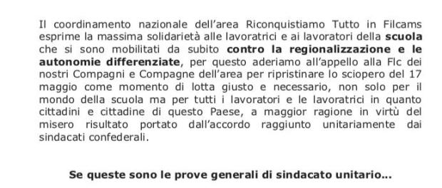 ll coordinamento nazionale dell’area Riconquistiamo Tutto in Filcams esprime la massima solidarietà alle lavoratrici e ai lavoratori della scuola che si sono mobilitati da subito contro la regionalizzazione e le autonomie differenziate, per questo aderiamo all’appello alla Flc dei nostri Compagni e Compagne dell’area per ripristinare lo sciopero del 17 maggio come momento di lotta giusto e necessario, non solo per il mondo della scuola ma per tutti i lavoratori e le lavoratrici in quanto cittadini e cittadine di questo Paese, a maggior ragione in virtù del misero risultato portato dall’accordo raggiunto unitariamente dai sindacati confederali.