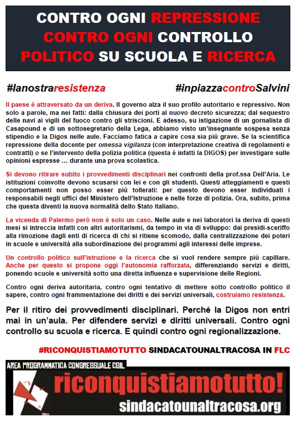 Qui sotto il volantino per i presidi e le manifestazioni di questa settimana, per il ritiro dei provvedimenti disciplinari contro la prof.ssa Dell’Aria, perché la Digos non entri mai in un’aula, per difendere la scuola e la ricerca pubblica come tutti servizi e diritti universali. Contro ogni controllo politico su scuola e ricerca e quindi contro ogni regionalizzazione.