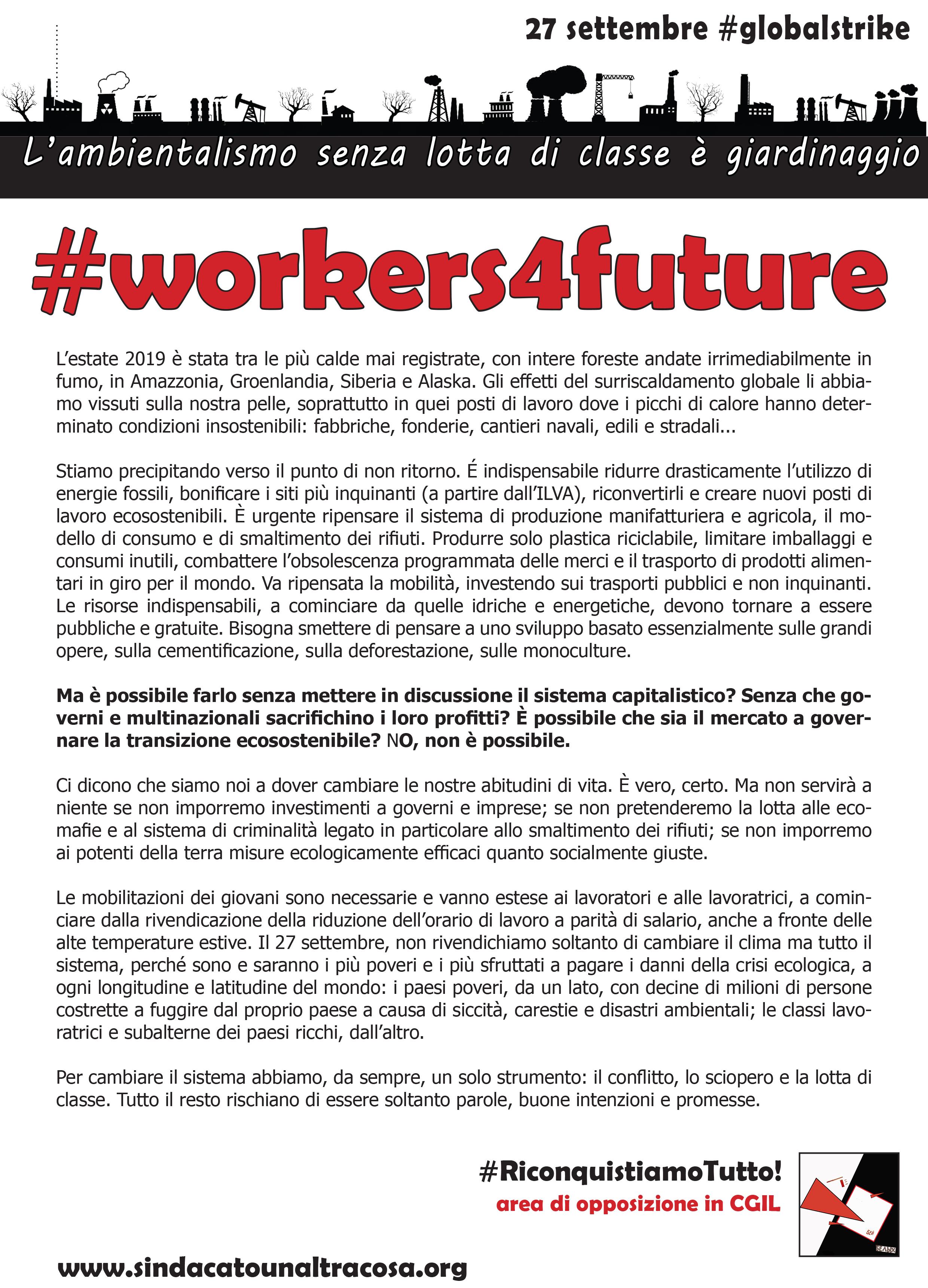 Le mobilitazioni dei giovani sono necessarie e vanno estese ai lavoratori e alle lavoratrici, a cominciare dalla rivendicazione della riduzione dell’orario di lavoro a parità di salario, anche a fronte delle alte temperature estive. Il 27 settembre, non rivendichiamo soltanto di cambiare il clima ma tutto il sistema, perché sono e saranno i più poveri e i più sfruttati a pagare i danni della crisi ecologica, a ogni longitudine e latitudine del mondo: i paesi poveri, da un lato, con decine di milioni di persone costrette a fuggire dal proprio paese a causa di siccità, carestie e disastri ambientali; le classi lavoratrici e subalterne dei paesi ricchi, dall’altro.