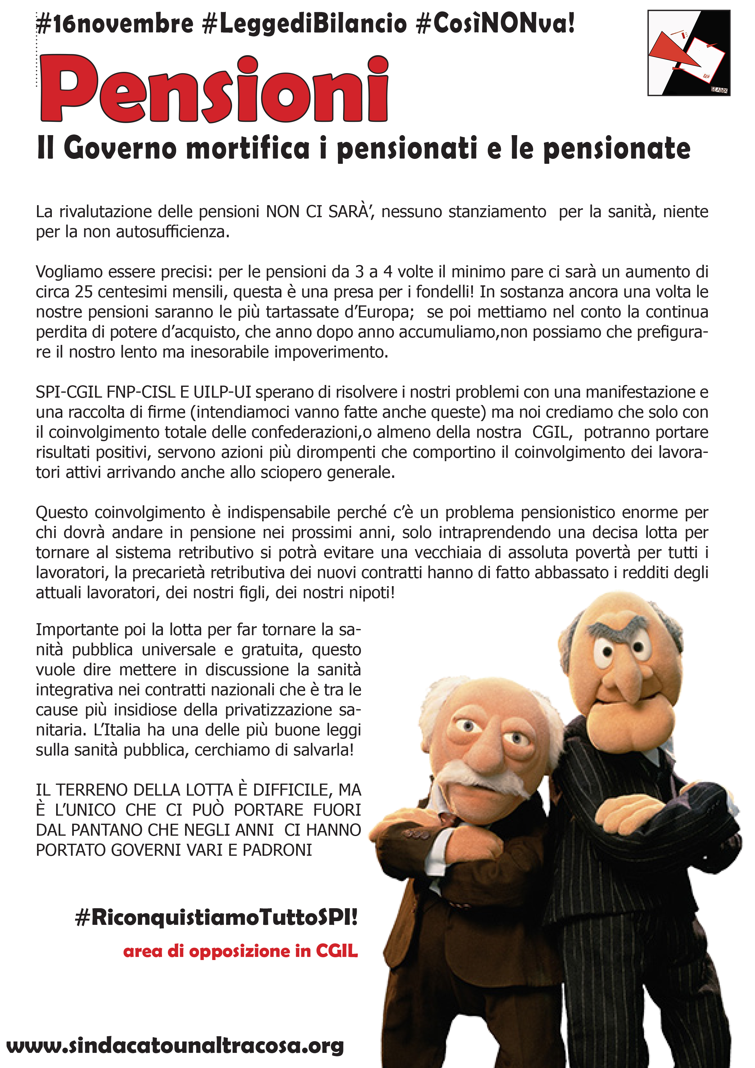 SPI-CGIL FNP-CISL E UILP-UI sperano di risolvere i nostri problemi con una manifestazione e una raccolta di firme (intendiamoci vanno fatte anche queste) ma noi crediamo che solo con il coinvolgimento totale delle confederazioni, o almeno della nostra CGIL, potranno portare risultati positivi, servono azioni più dirompenti che comportino il coinvolgimento dei lavoratori attivi arrivando anche allo sciopero generale.