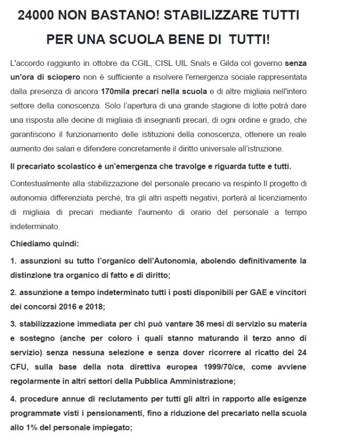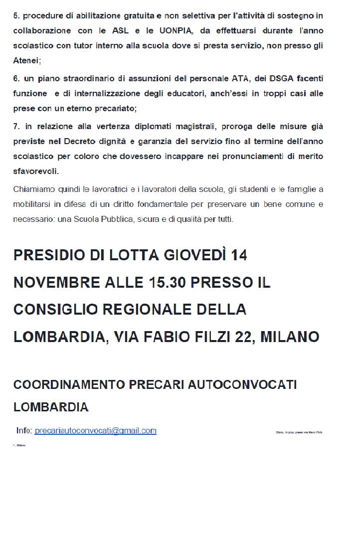 Presenti alla riunione alcune decine di lavoratori e lavoratrici, di quasi una ventina di scuole della provincia. È stata elaborata e discussa una piattaforma di rivendicazioni miranti alla stabilizzazione dei precari della scuola, dettate dalla consapevolezza che soltanto un percorso di lotte potranno portare ad un compimento di una politica di stabilizzazione delle decine di migliaia di insegnanti precari grazie ai quali ogni anno le scuole italiane possono aprire. In un territorio come la Lombardia, dove gli insegnanti precari sono decine di migliaia è sorta come esigenza la nascita di un coordinamento dal basso che ascolti e porti avanti le istanze di queste migliaia di lavoratrici, consapevoli che i lavoratori non hanno governi amici.
