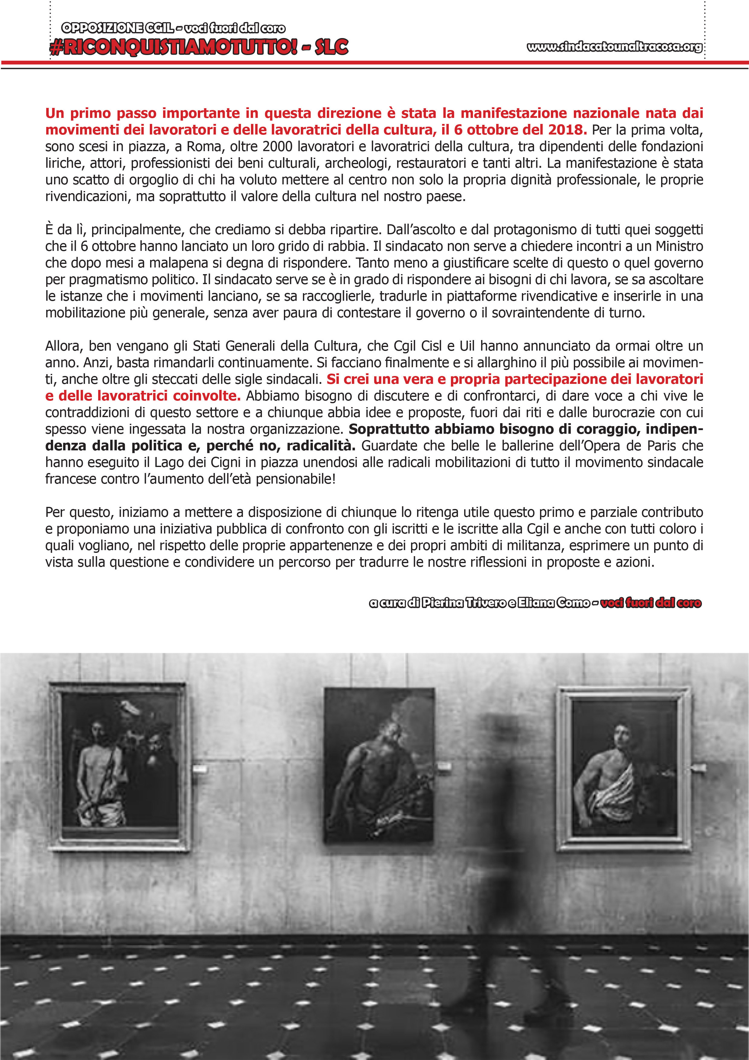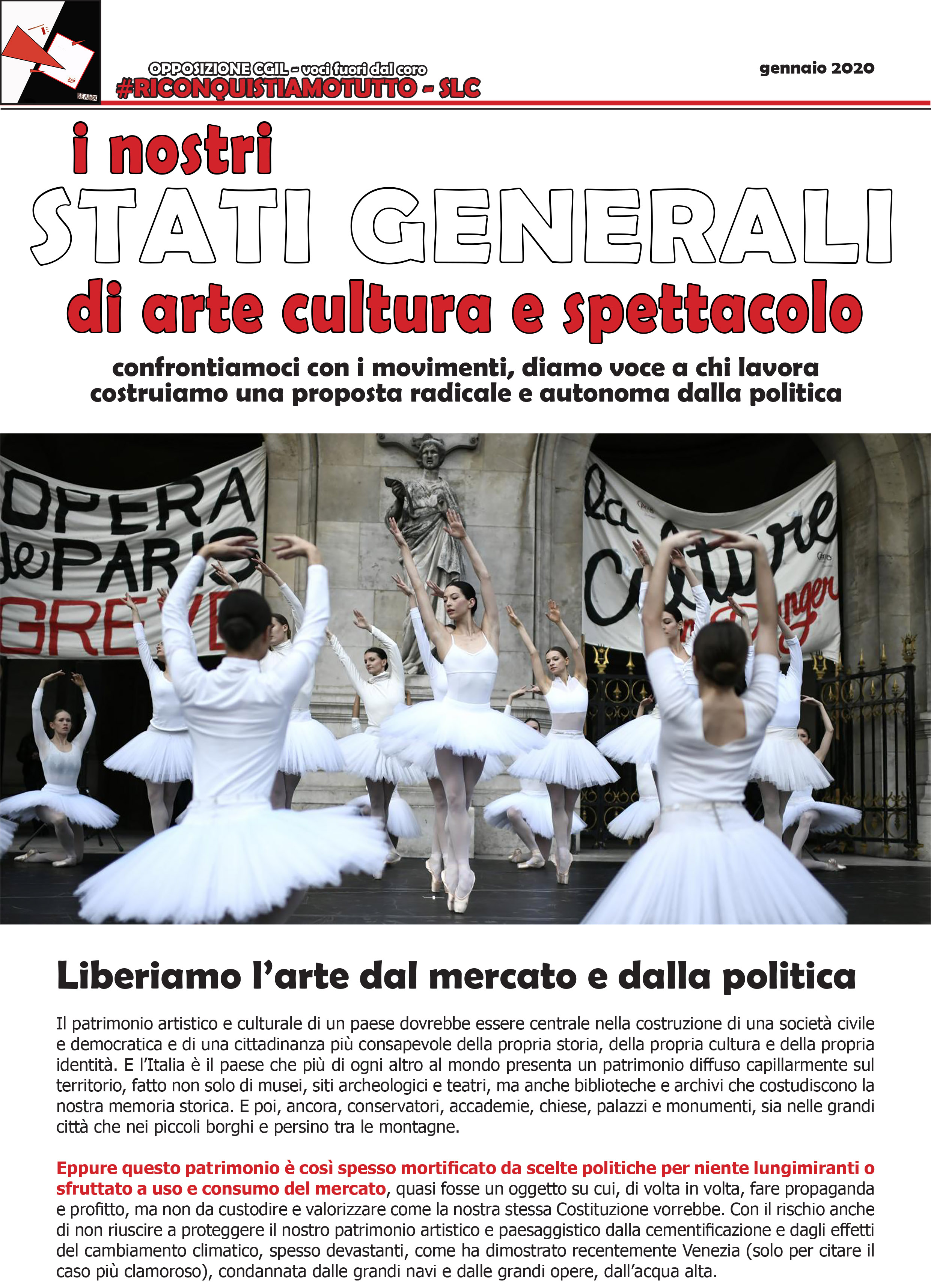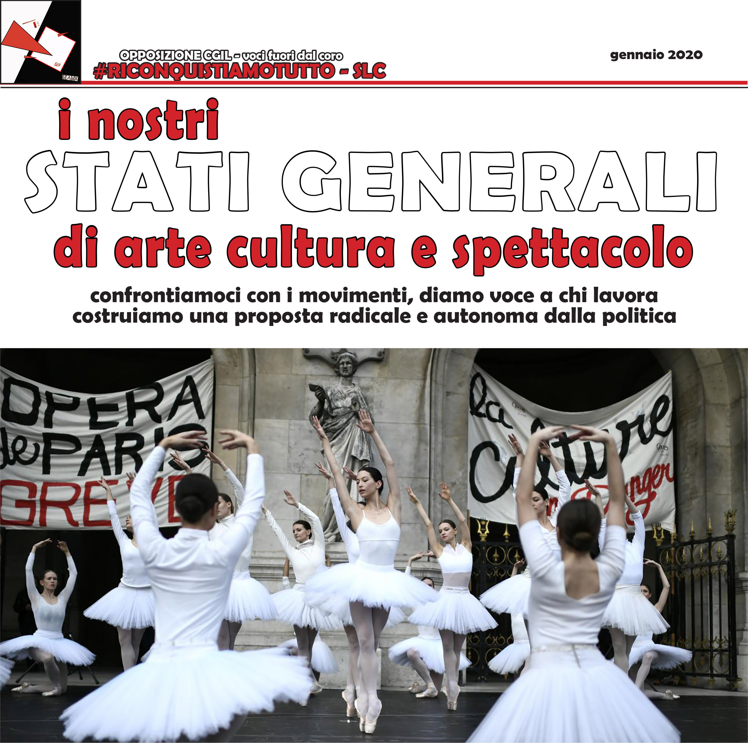 Allora, ben vengano gli Stati Generali della Cultura, che Cgil Cisl e Uil hanno annunciato da ormai oltre un anno. Anzi, basta rimandarli continuamente. Si facciano finalmente e si allarghino il più possibile ai movimenti, anche oltre gli steccati delle sigle sindacali. Si crei una vera e propria partecipazione dei lavoratori e delle lavoratrici coinvolte. Abbiamo bisogno di discutere e di confrontarci, di dare voce a chi vive le contraddizioni di questo settore e a chiunque abbia idee e proposte, fuori dai riti e dalle burocrazie con cui spesso viene ingessata la nostra organizzazione. Soprattutto abbiamo bisogno di coraggio, indipendenza dalla politica e, perché no, radicalità. Guardate che belle le ballerine dell’Opera de Paris che hanno eseguito il Lago dei Cigni in piazza unendosi alle radicali mobilitazioni di tutto il movimento sindacale francese contro l’aumento dell’età pensionabile!
