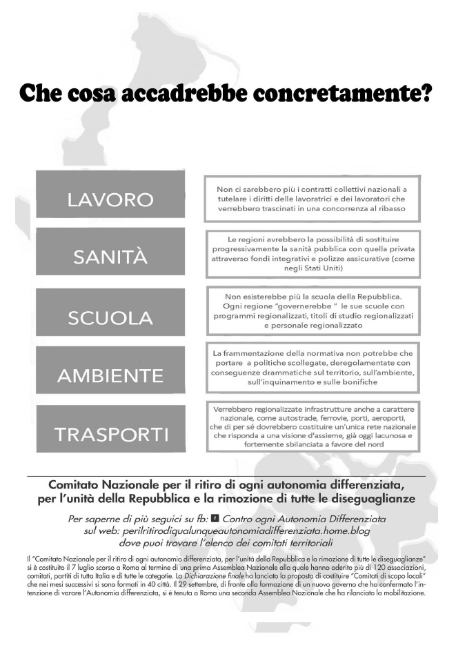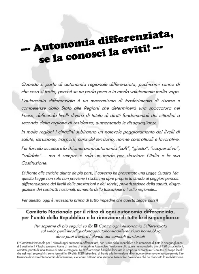 Dal 15 al 20 gennaio in tutta Italia è prevista una settimana di mobilitazione contro ogni autonomia differenziata (Per il ritiro di ogni autonomia differenziata), con presidi, volantinaggi e sit-in sotto prefetture e regioni (qui il calendario). Un volantino nazionale ricorda le principali ragioni di questa nuova mobilitazione (qui il testo in pdf): la contestazione del percorso che le regioni Emilia Romagna, Veneto e Lombardia (recentemente seguite da diverse altre, dalle Marche al Piemonte) stanno portando avanti assieme al governo. Regioni governate dalla destra come dal centrosinistra, che vogliono scomporre e diversificare servizi e diritti universali, a partire dalla scuola, i trasporti, la difesa dll’ambiente.