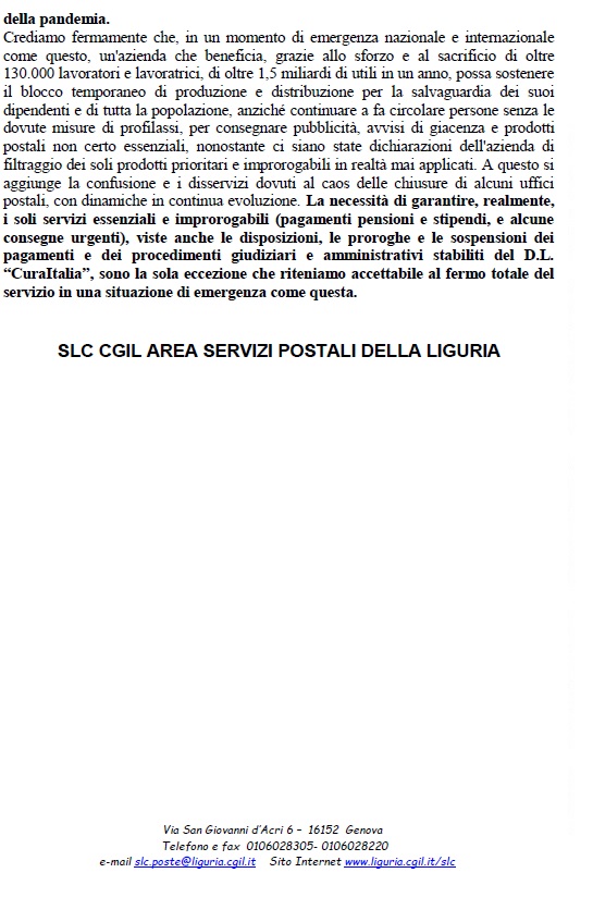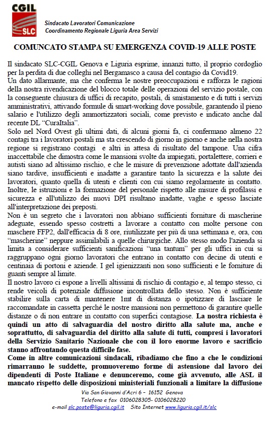 POSTE. Blocco temporaneo di produzione e distribuzione! Un comunicato dell'Area servizi postali SLC Liguria Pubblicati su 21 marzo 2020 da lucascacchi in categorie, TLC-poste-arte, z_carosello // 0 Commenti Qui il comunicato in pdf. Condividi: Condividi su X (Si apre in una nuova finestra) X Condividi su Facebook (Si apre in una nuova finestra) Facebook Stampa (Si apre in una nuova finestra) Stampa Invia un link a un amico via e-mail (Si apre in una nuova finestra) E-mail Condividi su WhatsApp (Si apre in una nuova finestra) WhatsApp Condividi su Telegram (Si apre in una nuova finestra) Telegram Mi piace Caricamento... Correlati liguraposte italianeSLC