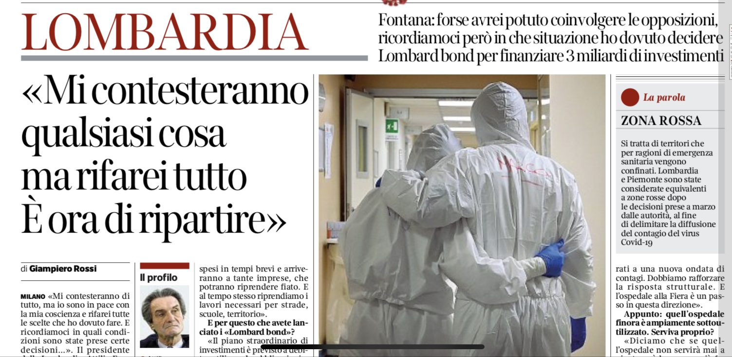 FONTANA, GOVERNATORE LOMBARDO DICE CHE RIFAREBBE TUTTO QUELLO CHE HA FATTO FINORA (articolo di oggi sul Corriere). CIOÈ HA SBAGLIATO TUTTO, COME DEL RESTO MOLTI POLITICI REGIONALI E NAZIONALI DI TUTTE LE OPZIONI POLITICHE, AL SERVIZIO DI CONFINDUSTRIA CHE HA DECISO, DECIDE E DECIDERÀ QUANDO RITORNARE AL LAVORO (ANCHE SE IN VERITÀ IN LOMBARDIA MOLTE ATTIVITÀ NON HANNO MAI SMESSO)…..