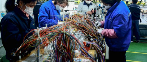 In this Feb. 13, 2020, photo, masked workers assemble wiring for automobile at a factory in Qingdao in east China's Shandong province. Automakers are gradually reopening factories in China that were idled by anti-virus controls as they try to reverse a sales slump in their biggest market. (Chinatopix via AP)