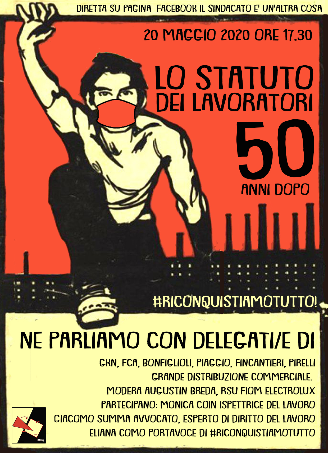 Qualche giorno fa, alla Electrolux gli operai e le operaie (tra i più tradizionali che ci sono!) hanno dovuto scioperare per il diritto a respirare, a causa delle mascherine. Mai come ora dobbiamo davvero Riconquistare Tutto, dal diritto alle assemblee, al diritto di denunciare il mancato rispetto delle norme di sicurezza, al diritto persino di avere la mensa o gli spogliatoi o le docce, al diritto di fare due parole alla macchinetta del caffè. Fino al diritto a respirare.