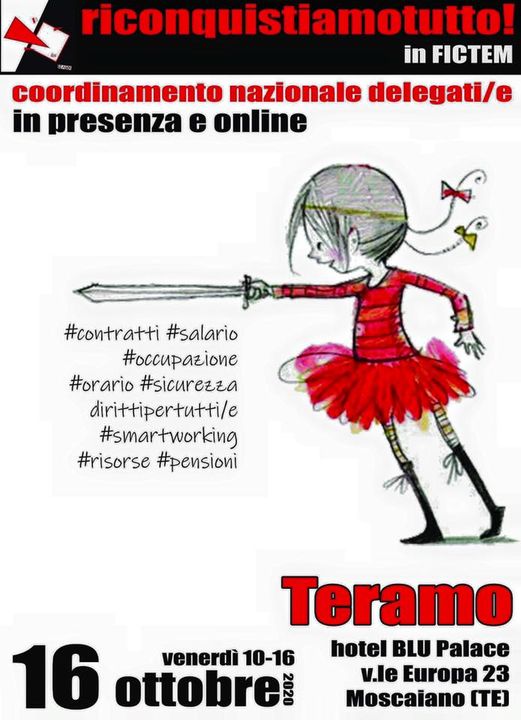 Venerdì 16 ottobre nei pressi di Teramo (Mosciano, hotel BLU Palace, viale Europa 23), si terrà il coordinamento nazionale dei compagni/e Filctem di #RiconquistiamoTutto! Per chi non potrà essere presente a Teramo, prevederemo il collegamento online. Sarà presente Eliana Como, portavoce nazionale dell’area.