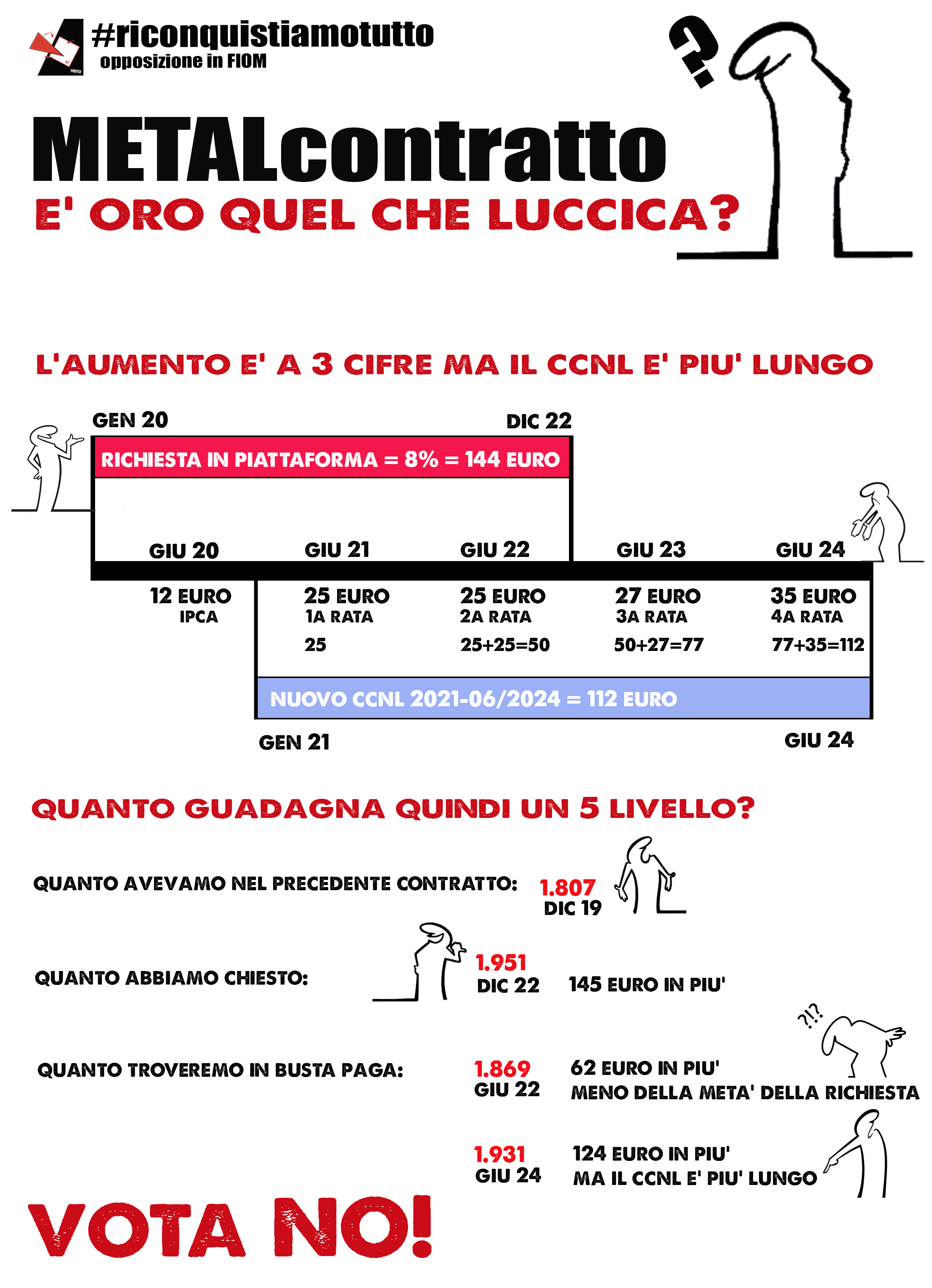 Il ccnl dei metalmeccanici del 2016 è stato un disastro per i salari e le condizioni di lavoro. Si è accettato Metasalute, i flexible benefits, l’aumento delle ore di straordinario e di flessibilità, l’assorbibilità degi aumenti, la variabilità dei primi di risultato in azienda e, sul piano salariale, un sistema di calcolo basato sull’inflazione IPCA, che ha portato in questi anni a aumenti salariali bassissimi e a giugno dell’anno successivo: meno di 40 euro complessivi.