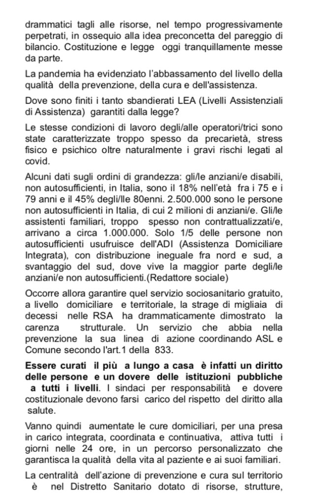 Occorre allora garantire quel servizio sociosanitario gratuito, a livello domiciliare e territoriale, la strage di migliaia di decessi nelle RSA ha drammaticamente dimostrato la carenza strutturale. Un servizio che abbia nella prevenzione la sua linea di azione coordinando ASL e Comune secondo l’art.1 della 833.