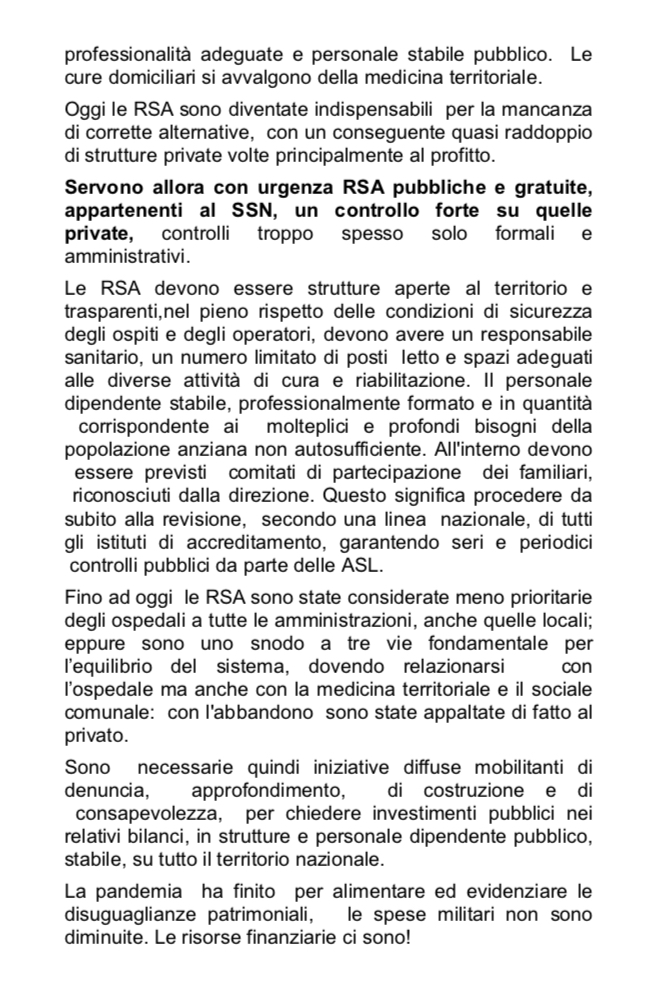 Servono allora con urgenza RSA pubbliche e gratuite, appartenenti al SSN, un controllo forte su quelle private, controlli troppo spesso solo formali e amministrativi.