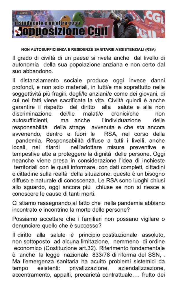 Occorre allora garantire quel servizio sociosanitario gratuito, a livello domiciliare e territoriale, la strage di migliaia di decessi nelle RSA ha drammaticamente dimostrato la carenza strutturale. Un servizio che abbia nella prevenzione la sua linea di azione coordinando ASL e Comune secondo l’art.1 della 833.