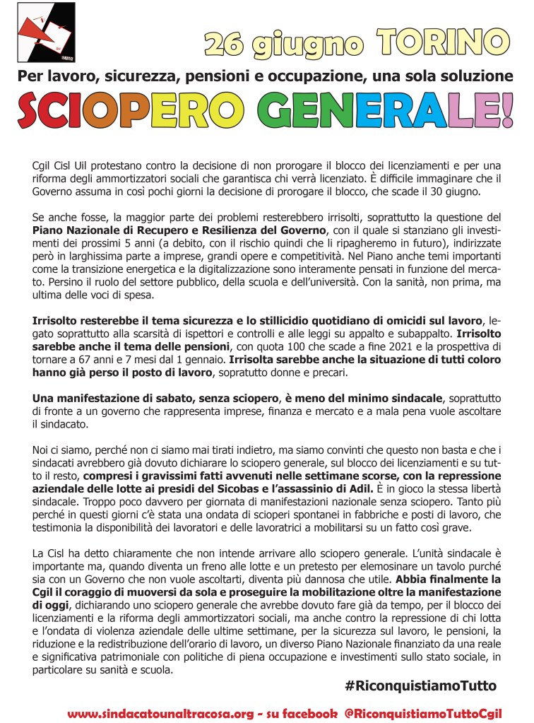 La Cisl ha detto chiaramente che non intende arrivare allo sciopero generale. L’unità sindacale è importante ma, quando diventa un freno alle lotte e un pretesto per elemosinare un tavolo purché sia con un Governo che non vuole ascoltarti, diventa più dannosa che utile. Abbia finalmente la Cgil il coraggio di muoversi da sola e proseguire la mobilitazione oltre la manifestazione di oggi, dichiarando uno sciopero generale che avrebbe dovuto fare già da tempo, per il blocco dei licenziamenti e la riforma degli ammortizzatori sociali, ma anche contro la repressione di chi lotta e l’ondata di violenza aziendale delle ultime settimane, per la sicurezza sul lavoro, le pensioni, la riduzione e la redistribuzione dell’orario di lavoro, un diverso Piano Nazionale finanziato da una reale e significativa patrimoniale con politiche di piena occupazione e investimenti sullo stato sociale, in particolare su sanità e scuola.