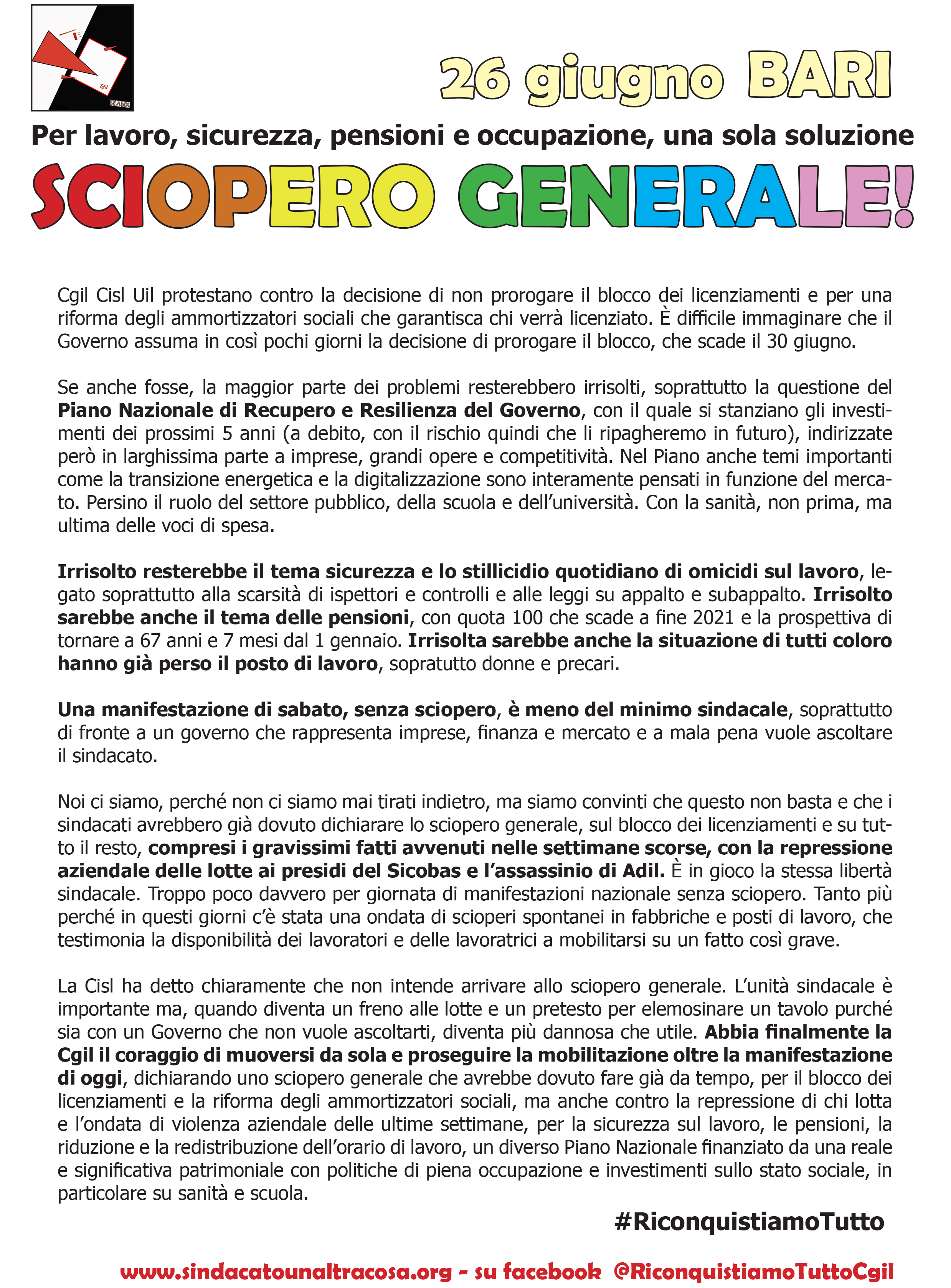 26 giugno in piazza, ma senza sciopero generale!