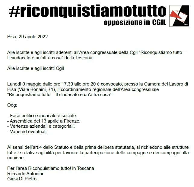 Lunedì 9 maggio dalle ore 17.30 alle ore 20 è convocato, presso la Camera del Lavoro di Pisa (Viale Bonaini, 71), il coordinamento regionale dell’Area congressuale “Riconquistiamo tutto – Il sindacato è un’altra cosa”.