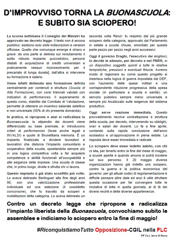 E subito sia sciopero: il volantino! Pubblicati su 2 Maggio 2022 da lucascacchi in conoscenza, z_carosello // 0 Commenti D’improvviso torna la buonascuola: contro il DL sul PNRR, sciopero entro la fine di maggio! Scarica qui in pdf. Condividi: Fai clic per condividere su X (Si apre in una nuova finestra) X Fai clic per condividere su Facebook (Si apre in una nuova finestra) Facebook Fai clic qui per stampare (Si apre in una nuova finestra) Stampa Fai clic per inviare un link a un amico via e-mail (Si apre in una nuova finestra) E-mail Fai clic per condividere su WhatsApp (Si apre in una nuova finestra) WhatsApp Fai clic per condividere su Telegram (Si apre in una nuova finestra) Telegram Mi piace Caricamento... Correlati dl pnrrscioperoscuolavolantino