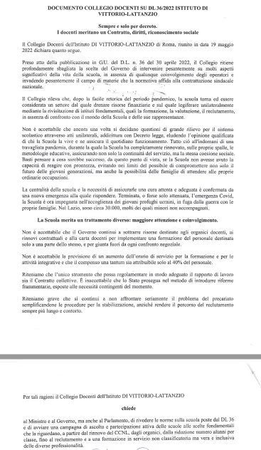 L’Assemblea Sindacale Unitaria RSU dell’IC di Torre del Lago, riunita in data 23/05/2022 preso atto della pubblicazione del Decreto Legge n. 36 del 30 Aprile 2022, relativo all’attuazione del Piano nazionale di Ripresa e Resilienza, ritiene estremamente critico il decreto nel metodo e nei suoi contenuti.